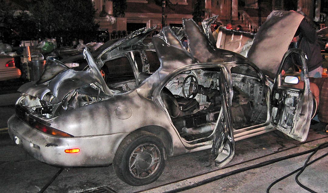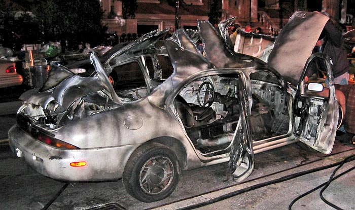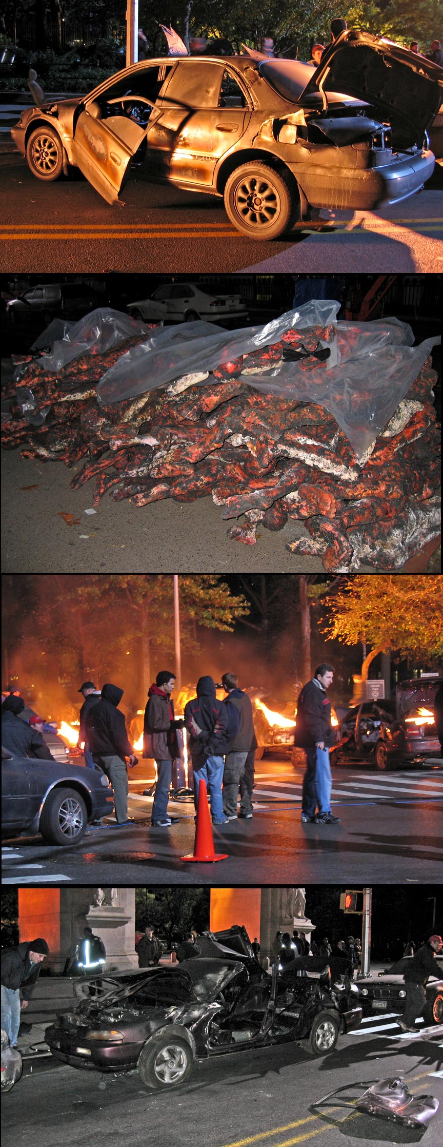 These are the last days of the filming of I Am Legend in Washington Square Park. Last night, onlookers were greeted with some surprises. There were piles of charred bodies, demolished autos like the one in the photo, and fires burning in the park and street (click here for more photos). The fire department was on the scene with a firetruck, apparently to be on site during the use of fire in the filming. The film, due out in 2007, is based on the novel of the same name by highly acclaimed author Richard Matheson.