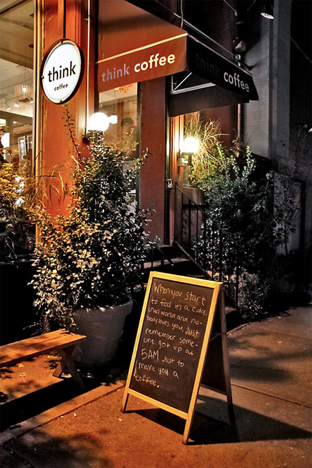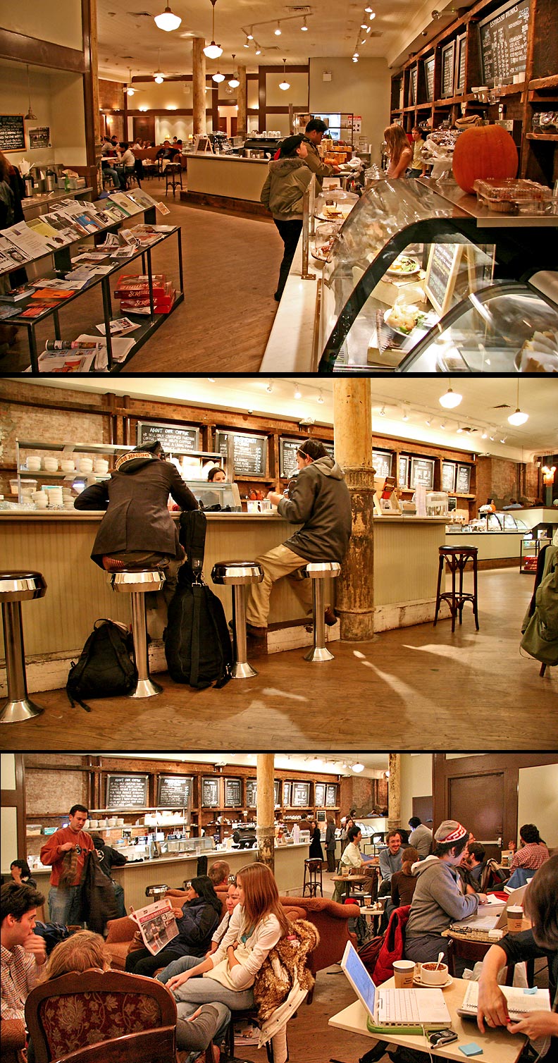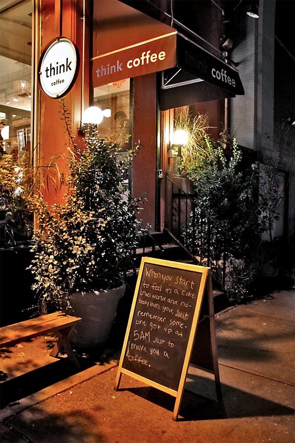 Think Coffee at 248 Mercer Street (near NYU) has become a favorite hangout for many, including myself and a friend who introduced me to it this summer. Click here for more photos. They have a mission statement: “Think Coffee is an independently-owned cafe with a socially and environmentally conscious bent and a community-oriented mission. We serve only Fair Trade, shade-grown, organic coffee, Fair Trade, organic teas, and local milk and ice cream fresh from the Hudson Valley.”
