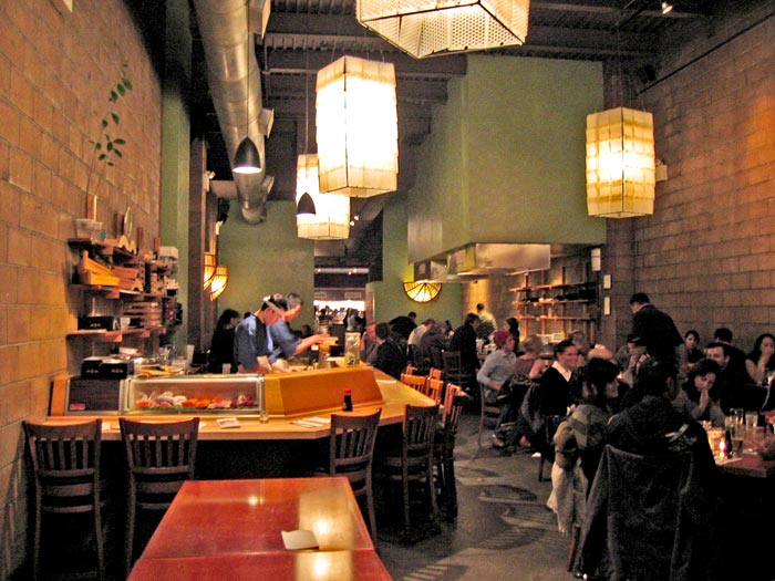 Plan-Eat Thailand was a small restaurant on Bedford Avenue. In 1999, it moved to its current location at 133 N. 7th Street and became Planet Thailand. The vast industrial space with soaring ceilings wraps around the corner to Berry Street. And, of course, the crowd is now trendier; many Manhattanites can be found. They have two bars, one done as a sculpture with glass bottles. There is a rowboat suspended from the ceiling. The menu is extensive with over 250 items – Thai, sushi, and Hibachi. Excellent food, inexpensive pricing. (There is also a Planet Thailand 212 in Manhattan on 24th Street.)