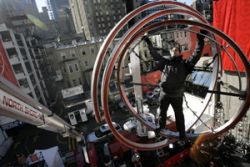 Above, David Blaine assists Target in a publicity stunt by escaping in time for their Black Friday sale starting at 6AM Friday. He was chained and suspended from a spinning gyroscope over Times Square. Above photo, AP/Seth Wenig – sorry folks, not my photo this time, but this AP photographer was able to capture the scene from above, and got a view of the city, while I was at my folks’ in Connecticut doing the traditional holiday thing…
