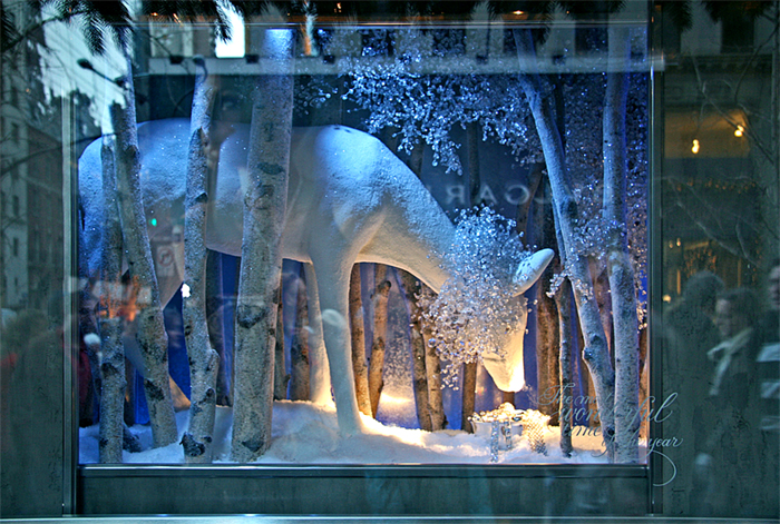 Many of the Christmas window displays of the top retailers along 5th Avenue are known worldwide, and millions of visitors come to see them – in some cases, lines are established for viewing. The windows at Tiffany’s were quite beautiful, with their winter scenes and slogan: The most Beautiful Time of the Year. I imagine many would not mind sharing the jeweled setting with that snowy deer…
