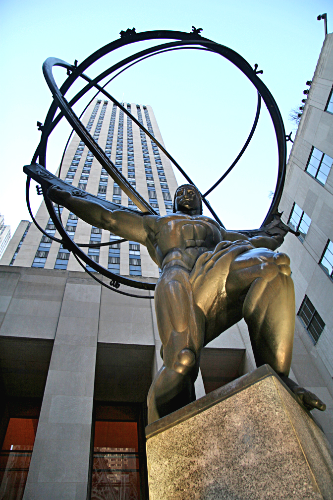 Nearly everyone is familiar with this Art Deco bronze sculpture at the Rockefeller Center complex, with Atlas shown holding up the heavens, his punishment by Zeus after his loss in the Battle of the Titans. It was created by Lee Lawrie in 1936 – he has 14 pieces attributed to him at Rockefeller Center. Lawrie (1877-1963) was born in Germany and moved to Chicago in 1882. At age 14, he began working for many sculptors in Chicago; he later moved east, where his work with Ralph Adams Cram and Bertram Goodhue brought him into the art world limelight.