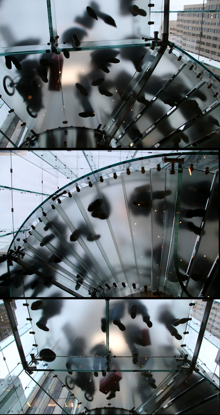 Excellent photograph! We have a wonderful staircase, too, in the San Francisco store, but it’s just a straight glass staircase, nothing quite like this. Apple has proven once again how superior they are when it comes to aesthetics. That glass building is really something else. Awesome!