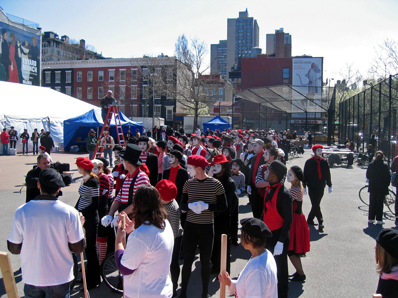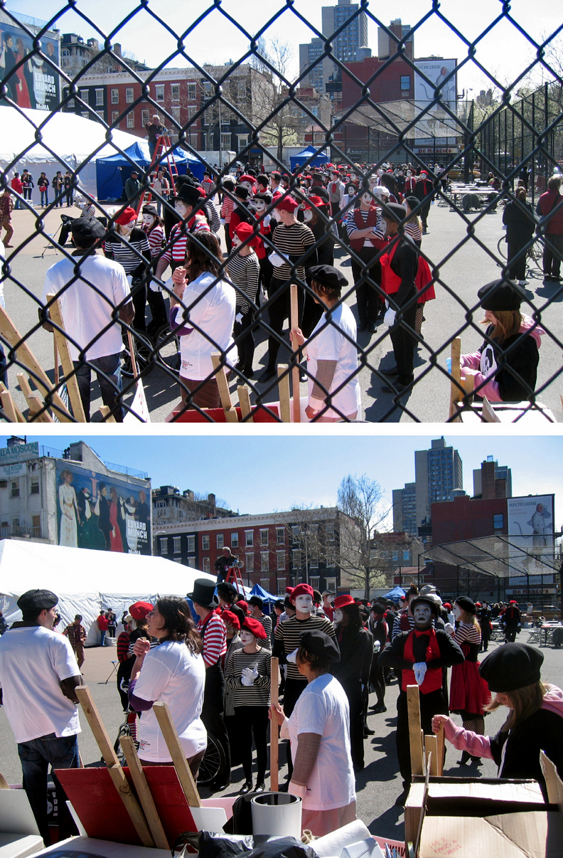 Ironically, while on my way to a juggling festival in Brooklyn, I caught this massive assemblage of mimes in a fenced playground out of the corner of my eye. I was inclined to just keep driving – after all, this kind of unpredictable insanity is not uncommon in the city. But then it occurred to me that hundreds of mimes gathered at 11:15 on a Sunday morning was a VERY uncommon site and that I should share it. So I made a split second decision to circle the block, park illegally in a bus stop, and snap a few quick photos through the openings in the fence, hoping I would get something usable (more photos here). I had no time to make inquiries, so I have no idea what this mysterious silent event was about – audition, filming ?