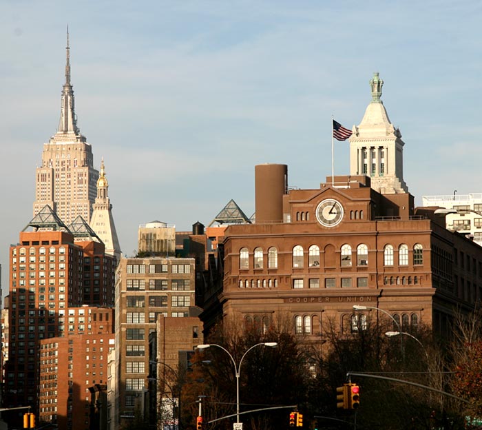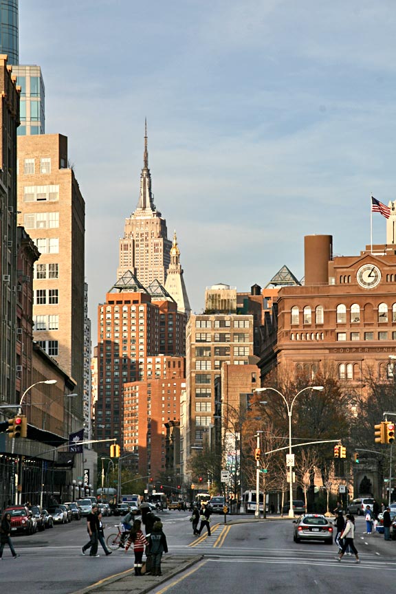 We New Yorkers are fortunate to have beautiful and inspiring streetscapes at nearly every turn. This vista is looking north along the Bowery from the Village. Click here for second photo. Here, we have a nice grouping of NYC landmarks: the Empire State building, of course, on the upper left; to its immediate right is the Metropolitan Life Tower. The 4 glass pyramids are the tops of the residential Zeckendorf Towers at Union Square. To the right is the Con Ed tower, headquarters of Consolidated Edison, our NYC utilities provider. The building below (with the flag atop it) is brownstone clad Cooper Union, the art, architecture, and engineering college.