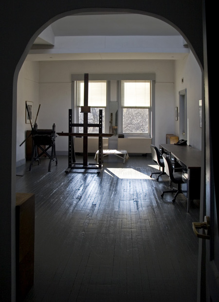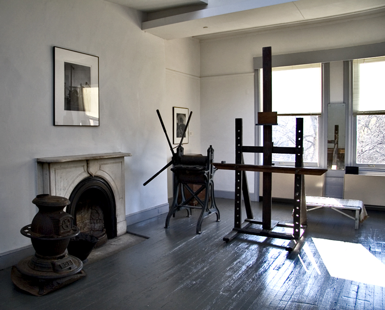 I was privileged, along with a handful of others, to get a tour with Virginia as guide of Hopper’s studio and the areas featured in the book and show: Washington Square North, Washington Mews, MacDougal Alley, and 8th Street. The photo shows Hopper’s studio with an easel, a printing press, and framed photos of Hopper (click here for second photo). The windows look out to Washington Square Park…