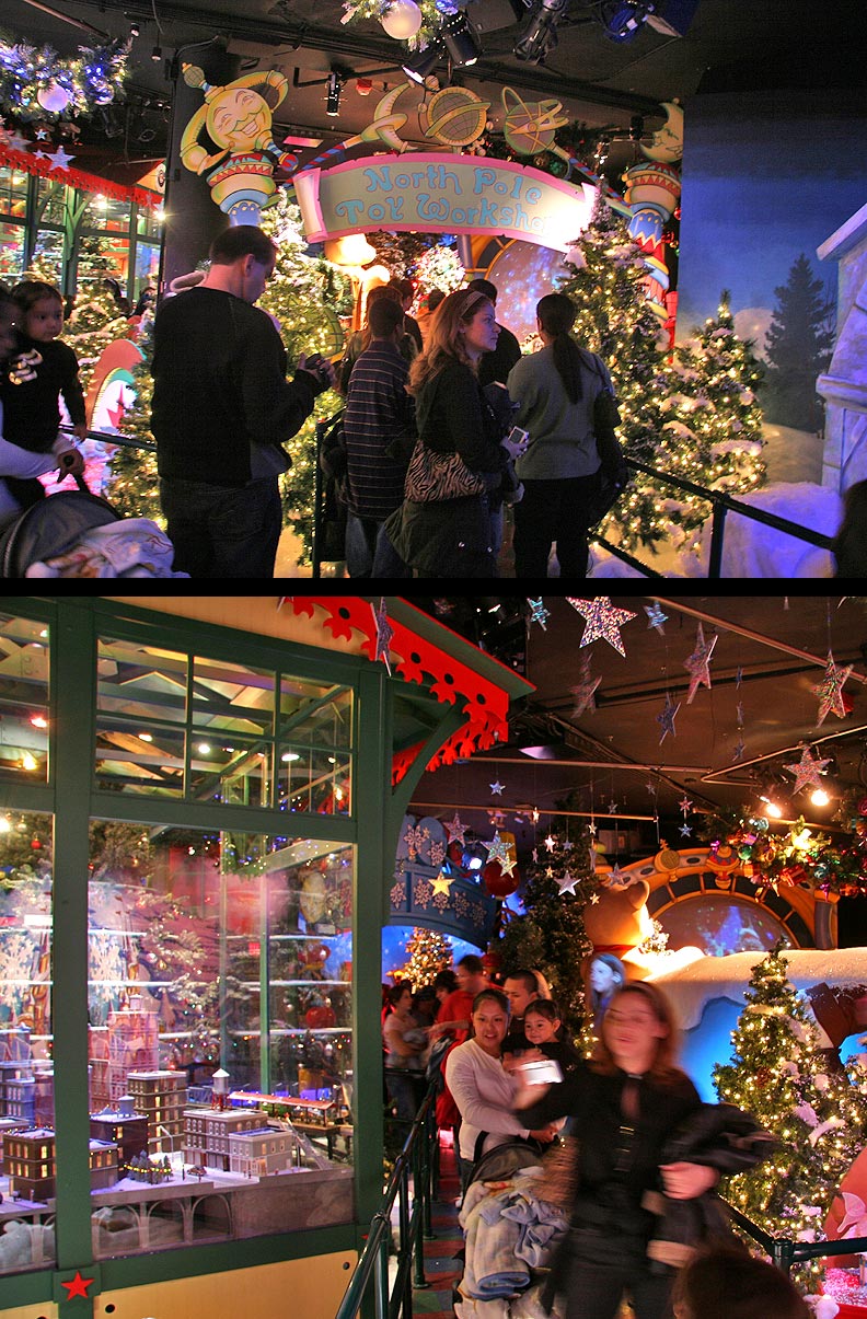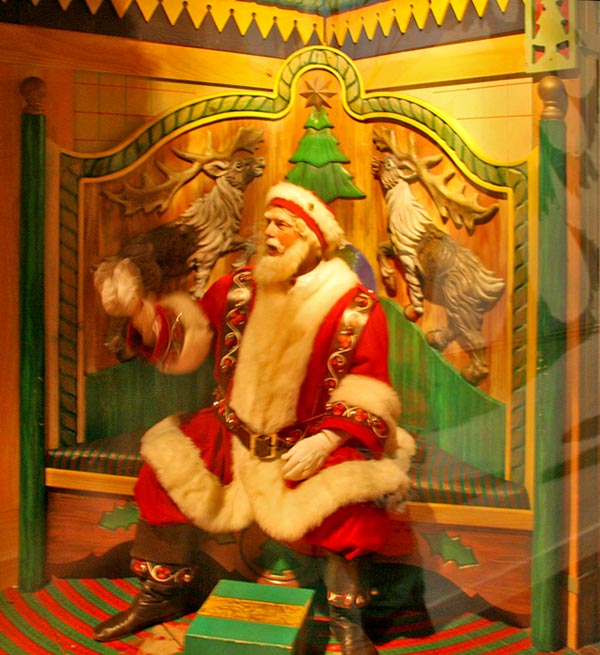 Everyone knows there are lots of Santa’s helpers around the world. But we also know that there is only one real Santa. And where is he? 34th Street and Broadway, of course, at Macy’s – on the 8th floor in Santaland (a mere glance at the quality of Santa’s wardrobe should alleviate any doubts). Click here for photos of Santaland. The lines were long, and I thought it was a good idea to leave sitting on Santa’s lap and gift-wishing to the younger ones. So I opted to go to the line where one could get a peek at Santa – he was behind glass, hence the reflections.