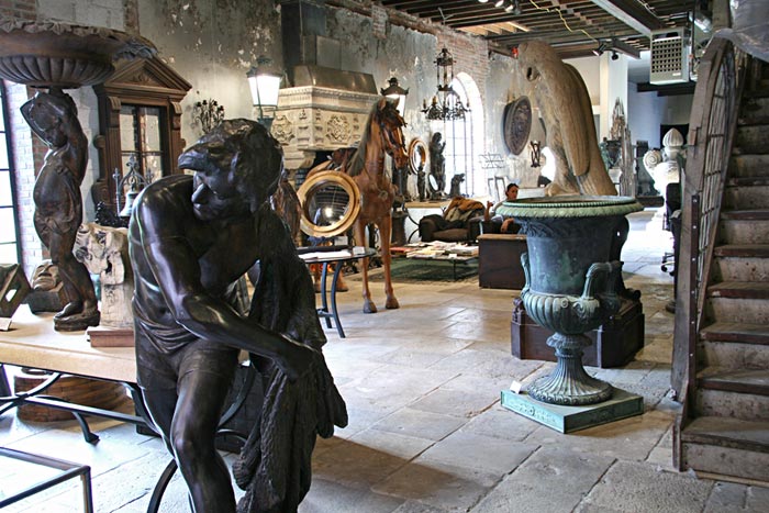 This gallery was a phenomenal find. It is one of the most striking, atmospheric spaces I have seen. The gallery, co-owned by partners Allan Reiver and Avi Kendi, is on the ground floor of a beautiful small building in Little Italy at 209 Elizabeth Street, a former bakery and firehouse. The floors are 17th century stone from France (in fact, Allan Reiver travels to France to acquire the like for clients). A huge working fireplace is centerpiece, with sofas and reading material. Magnificent windows frame the Elizabeth Street Gardens with its statues, which can be accessed from the gallery. The place is filled with fabulous architectural, sculptural, and antique artifacts.