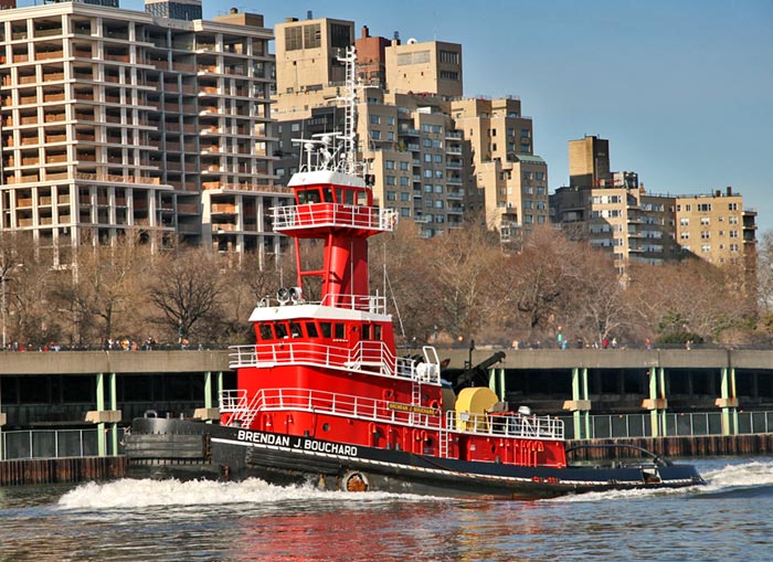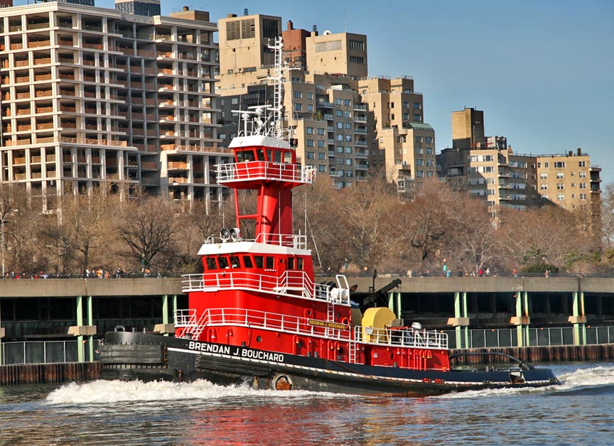 The tug in the photo navigating the East River, the Brendan J. Bouchard, belongs to the Bouchard Transportation Company of Melville, NY, an oil barging company. Most barges are not self-propelled and need tugboats to move them. And tugboats are highly maneuverable – they help make the sharp turns necessary to negotiate shipping channels and harbors such as that of New York’s. McAllister and Moran virtually dominate the tugboat business in the New York waters. Click here for an interesting story about the recent efforts of tugboats to move the Intrepid to New Jersey for refurbishment – an initial failure followed by success…