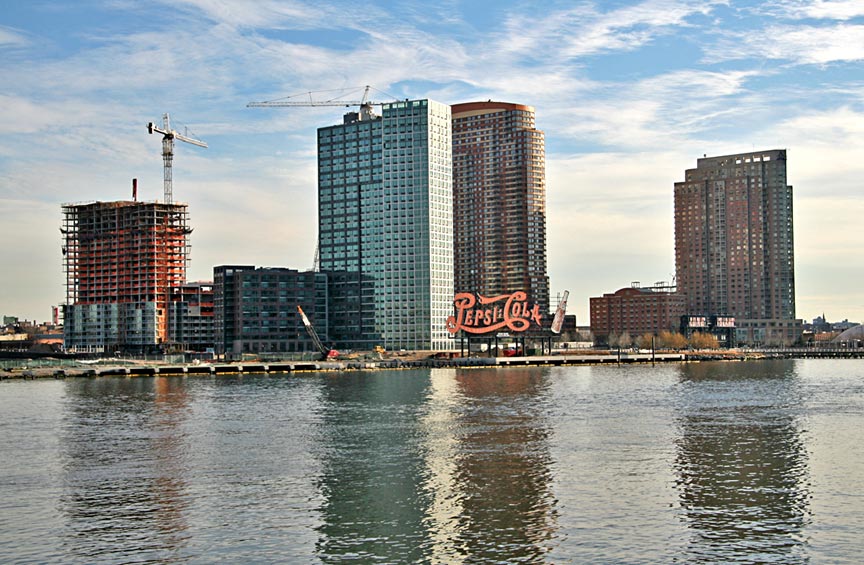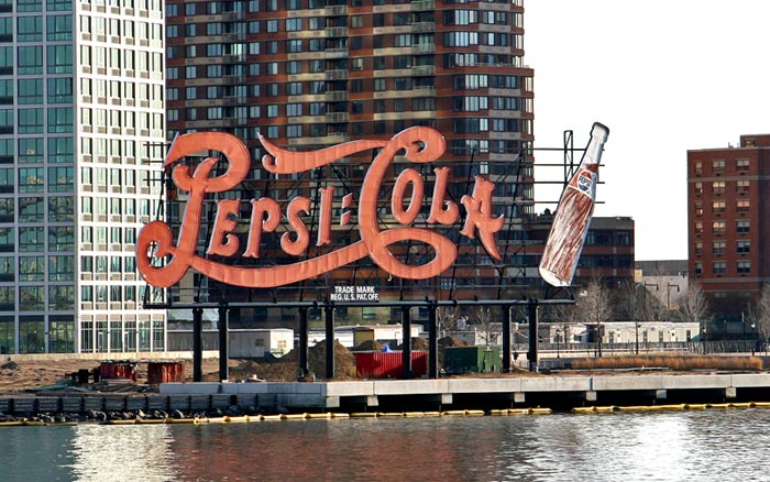 The multi-tube red sign, visible by day or illuminated at night, has been there for over 70 years. It was built in 1936 and rebuilt in 1994 by Artkraft Signs (now the Artkraft-Strauss Sign Co.), the oldest and last-surviving subsidiary of the original Claude Neon Co., headed by Frenchman George Claude, who held the patent for neon. In 2003, the Rockrose Development Corporation purchased the land for a $1 billion residential and commercial project. Click here for photo. The 120-foot Pepsi Cola sign was preserved – it was dismantled and re-erected 300 feet south to its current permanent location. It is nice to see that the value of a historic icon like this is appreciated and preserved by a real estate development company…
