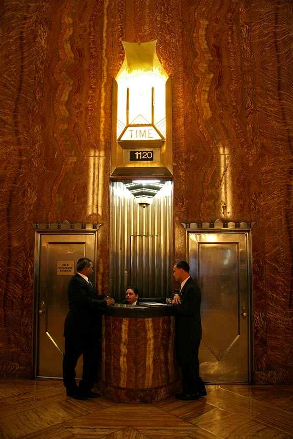 This is the reception desk with its illuminated clock in the lobby of the Chrysler Building. The 77-story Art Deco masterpiece at 405 Lexington Avenue was designed by William Van Alen and built in 1929. In the dark, warm retro lobby, we find red Moroccan marble walls, yellow Siena marble floors, amber onyx, blue marble trim, and chrome steel.