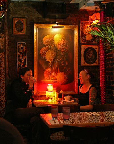 This is Yaffa Cafe at 97 St. Marks Place in the East Village. The food reviews, along with elements of their decor, are all over the map. Some love this place, some hate it. The decor has been described as garish kitsch – there is plastic fruit glued to the walls, Christmas tree lights hanging from the ceiling, and leopard and zebra prints on tables and booths, all in a dark atmosphere with a warm, reddish glow. The clientele is eclectic – a mix of the late-night club crowd, goth kids, slumming yuppies, and artists.