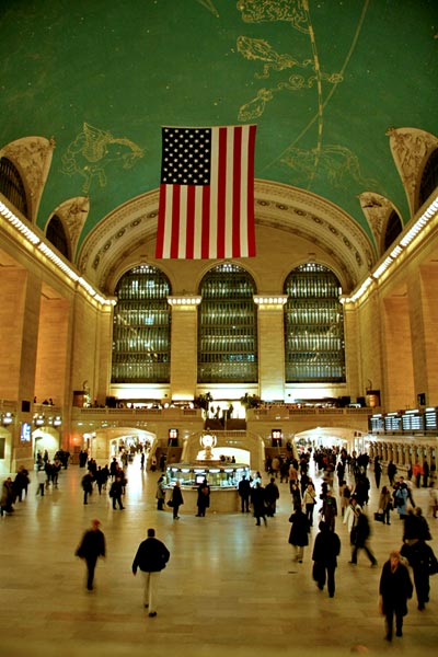 Officially Grand Central Terminal, the site has seen three different incarnations of the station, going back to Grand Central Depot in 1871. Amazingly, Grand Central was actually under real threat of various demolition proposals by Penn Central – a decade-long legal fight, with efforts of many including Jacqueline Kennedy Onassis and a United States Supreme Court ruling, succeeded in preservation. In 1976, Grand Central was designated as a National Historic Landmark. In 1998, the terminal completed a restoration, including the renowned ceiling mural with its constellations and beautiful cerulean sky, originally painted by Frenchman Paul Helleu. The large American flag was hung after 9/11. These are in the main concourse as seen in the photo.
