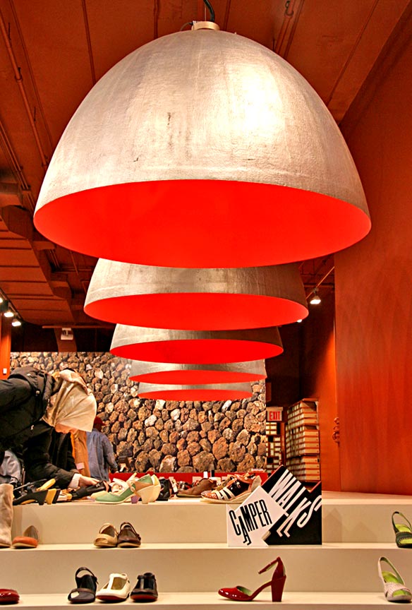 New Yorkers do love the special, unique, and unusual, as do the celebrities who patronize Camper in SoHo at 125 Prince Street. There are many fascinating talents behind this store, with its 5 gigantic lamps that hang above a footwear runway. Iconoclastic would well describe the shoes, interior designer, and lighting designer.