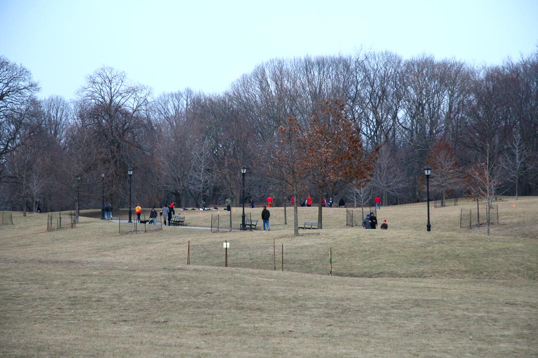 This is a view of Sullivan Hill from the Long Meadow in Prospect Park (click here for second photo of Lower Pool). The park, a 526-acre urban oasis located in the heart of Brooklyn, was designed by famed landscape architects Frederick Law Olmsted and Calvert Vaux, who also designed Central Park. This park and its Central Park kin are much more than just green oases – they have innumerable specialized environments and activities.