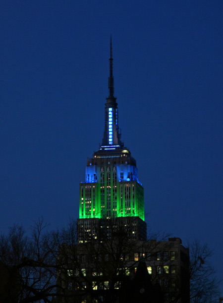 This blue and green lighting at the Empire State Building last night was to celebrate Earth Day, which marks the exact moment of the Vernal Equinox occurs (the first day of spring in the Northern Hemisphere). This was last night at 8:07 PM EDT (on the equinox, night and day are the same length anywhere on earth). The idea of an international Earth Day was introduced in 1969 by John McConnell, and in 1971, UN Secretary-General U Thant signed a proclamation to that effect.