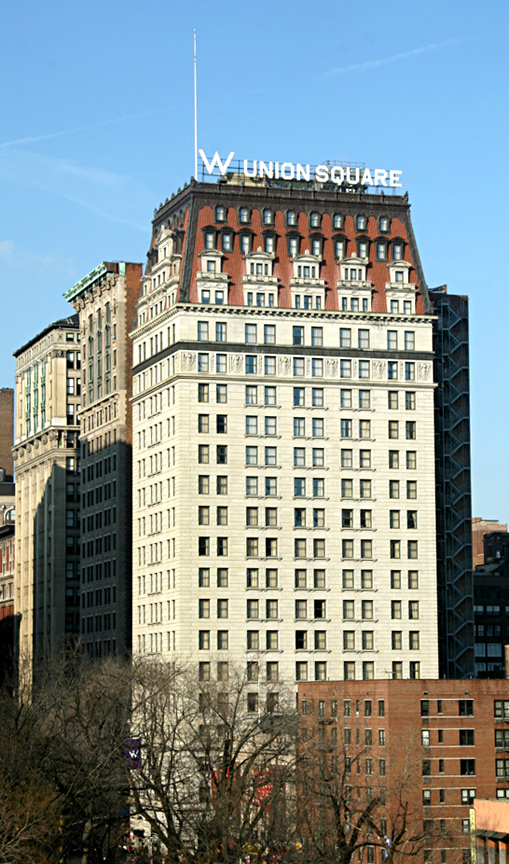 This is the W Hotel Union Square at 201 Park Ave South and 17th Street. This Beaux Arts marvel is probably the most architecturally notable building in the Union Square area, with its granite and limestone exterior and mansarded roof. The structure was built in 1911 to the designs of D’Oench & Yost for the Germania Insurance Company. The company name was changed during World War I to Guardian Life. In 2000, it completed its transformation as the W Hotel Union Square.