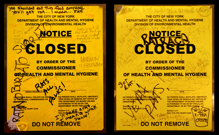 Since this episode, there have been many similar stories regarding other restaurants. I decided to stroll by the location last night and see the status. The place was completely closed, of course. The only things of interest were the two Department of Health notices on the windows, with an accumulation of comments written on them (click on the photo or this link to view a larger image for better reading). New Yorkers are extremely tolerant and adaptable. Very little really shocks us or for very long – even then, we bounce back rather quickly. And we have a good sense of humor, as evidenced by the comments on the notices. However, many doubt that Taco Bell will reopen at this location – how many would want to eat here? Tolerant or not, even New Yorkers can draw the line…