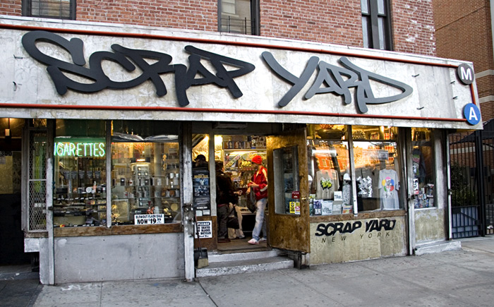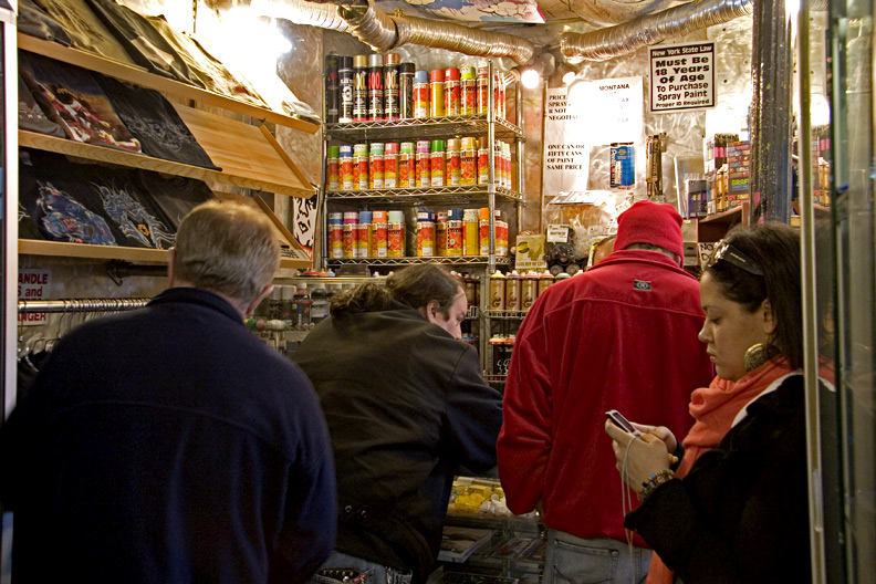 Until recently, I did not know there was a retail graffiti business. I assumed that the purveyors of the activity availed themselves of the various supplies from art and hardware stores. Like anything else, however, if there is a demand, someone will provide a supply. This small shop, the Scrap Yard at 300 West Broadway in SoHo just north of Canal Street, is owned and operated by Mark Awfe. It carries the requisite materials (paints, spray caps, etc.) and many other items such as T-shirts, hats, DVDs, books, magazines, mixed tapes, fat caps, video graff, collectibles – all related to graffiti. Click here for a peek inside.