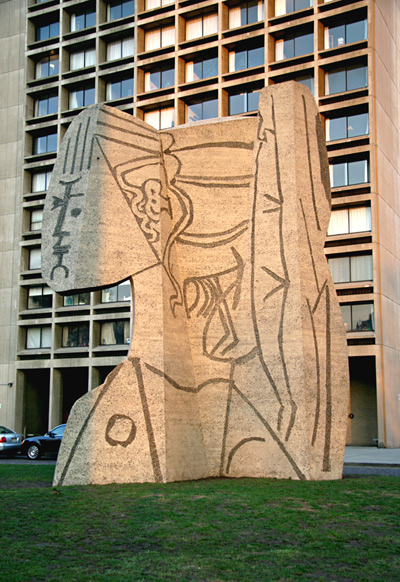 I find this small plaza and its surrounding buildings somewhat bleak, however, architectural reviews generally seem quite favorable, citing many unique features of the design and construction of the towers. The sculpture’s concrete was made with a Norwegian black stone aggregate, sandblasted to recreate the etched black lines of the original. Picasso was involved in the scaled translation, material, and its placement in the plaza. In 1972, Christo (the environmental installation artist who did the Gates of Central Park numerous other works) did a wrapping of the sculpture, Wrapped Sylvette…