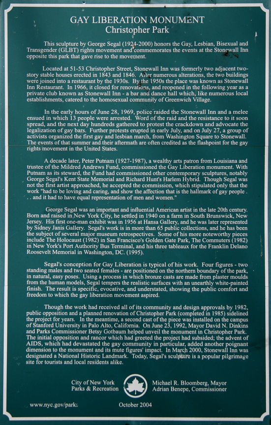 “This sculpture by George Segal (1924-2000) honors the Gay, Lesbian, Bisexual and Transgender (GLBT) rights movement and commemorates the events at the Stonewall Inn opposite this park that gave rise to the movement.” Thus reads the plaque at the Gay Liberation Monument in Christopher Park in the West Village. George Segal (1924-2000) is a well-known sculptor, and this work was inaugurated in 1992 after a 12-year battle of controversy and opposition (a cast of the sculpture installed on Stanford University’s campus in 1984 faced a decade of vandalism and beatings). The Stonewall Inn is just out of view to the right in the photo. If you are unfamiliar with the Stonewall Riots of July 1969, you can read about them here. Many consider the events of that summer pivotal in the gay rights movement.