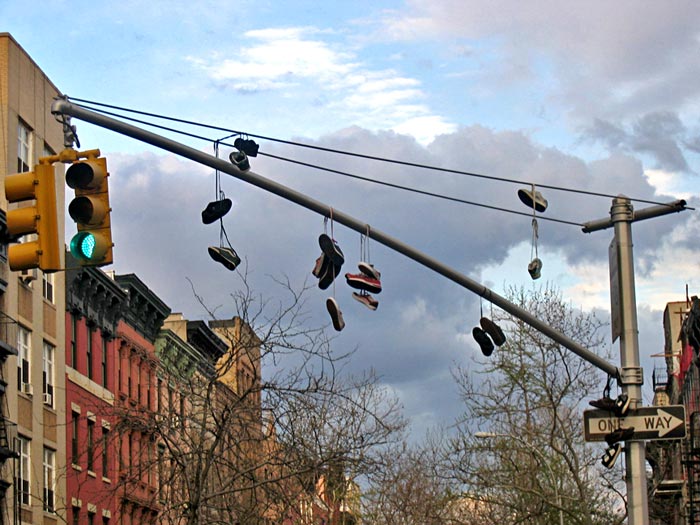 The article link in “the Villager” newspaper does an indepth look at this, and it turns out that the drug dealer thing is urban myth, along with some other, potentially more personal meanings that were said to be going on. It’s cool though that it’s become something so iconic that people are actually making replicas and mimicing the actions of throwing up the sneakers like a ritual, and also dismaying that commerical interests are trying to use it as advertising, the Red Bull soft drink makers putting them up there, too. Pretty funny, we thought you would enjoy it, I had often wondered what the real story was…