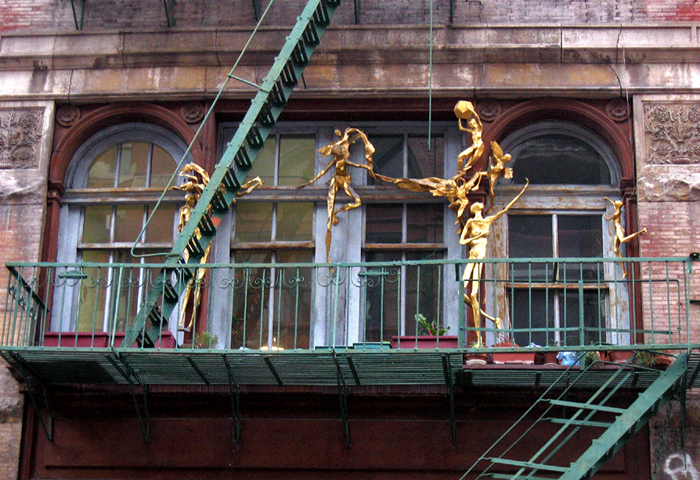 Artistic expression is everywhere you look in NYC – street musicians, chalk painters on sidewalks, urban graffiti art, colored glass appliques on lamp posts, photographs and art being sold or exhibited on the street, etc. Sometimes you need to look up. We spotted these sculptures on the second floor fire escape of the six-story residential loft building at 24 Bond Street, a side street off Broadway in NoHo.* The building was also the home of photographer Robert Mapplethorpe. The creation is the work of resident sculptor Bruce Williams. The male dancers, covered in gold, have been present since 1998…