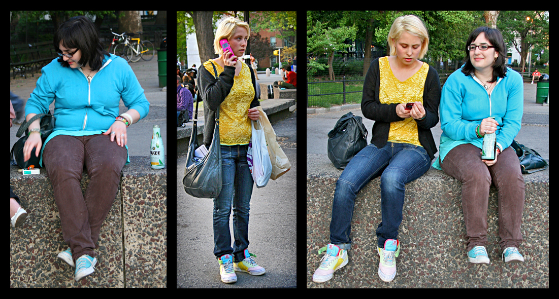 Yesterday evening, a friend pointed out a young woman (Anna) who was remarkably immersed in shades of blue/turquoise/aqua – aqua shirt, turquoise sweatshirt, blue sneakers, light blue/aqua beverage container, and blue-green on her cigarette pack. Her friend also had her own blue-green accents and beverage. While deciding whether or not this was a blog-worthy event (I am a big fan of turquoise & aqua, so objectivity was a problem), to our amazement, along came a yellow-themed woman (Rachael) – golden blond hair, yellow shirt, and yellow accented sneakers which also had blue accents matching Anna’s (not to mention a hot pink phone and matching trim on her sneaker tongues).