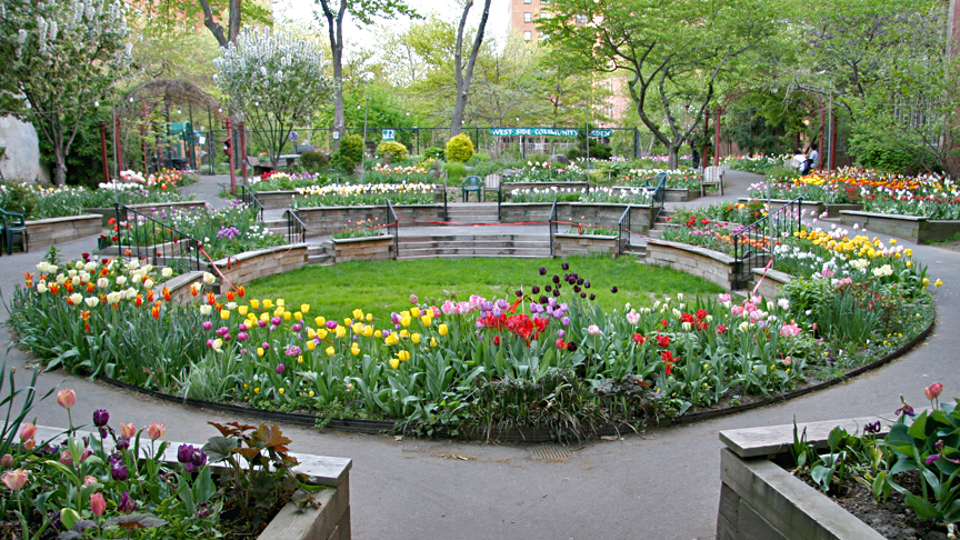 During the 1970s, half the block facing Columbus Avenue was razed for new buildings. Inadequate funds led to an abandoned plot. By the time real estate developers were ready to build, the space had been transformed into a garden by local residents (many community gardens in the city have started this way). The community was aided in saving this space by Community Board 7, the Trust for Public Land, private fundraising, and developer Jerome Kretchmer, who included the garden in his development plan. “How could a green open space not be a good amenity?” Kretchmer asks. “I get my money’s worth a hundred times a year.”