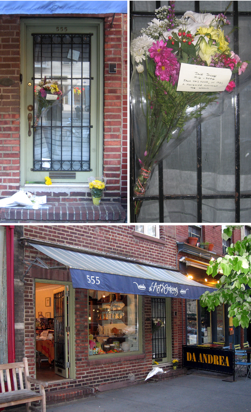 This is the house where Jane Jacobs, who died yesterday, wrote the Death and Life of Great American Cities. From those windows, she observed the urban life of her West Village neighborhood, which she offered as an alternative to the suburban sprawl and car culture taking over the country. Her work became a major influence on urban planning and the appreciation of city life in the US, convincing many Americans that cities were good. She was instrumental in saving the Village and Soho neighborhoods, which were threatened by urban planners who wanted to build the Lower Manhattan Expressway. She was a self-taught outsider who criticized and triumphed over very entrenched authorities. More photos here.