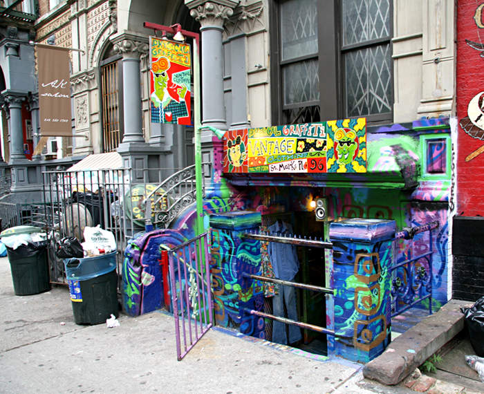 Physical Graffiti is both the name of a small vintage clothing boutique at 96 St. Marks Place shown in the photo and a Led Zeppelin album which used the very same building and the adjoining building at 98 St. Marks Place for the album’s cover (click here for photo). The building was also used as backdrop for a Rolling Stones music video for Waiting on a Friend. This shop abuts the subject of a previous post, Cappuccino and Tattoo, part of which can be seen on the right. Is this an obsession with St. Marks Place on my part? Not really. New Yorkers know that St. Marks Place has been NYC’s (and one of the country’s) epicenter of a number of counter-cultural movements. Dominated by retail, the concentration of shops on St. Marks Place reflects the current flavor. The street has been home to hippies, yippies, punks, political activists and protest marches, renowned bookstores, music stores and clubs (e.g. Electric Circus), graffiti artists, cafes, clothing shops, restaurants, bars, theaters, gangsters, and St. Marks Church. Physical graffiti well describes the street itself.