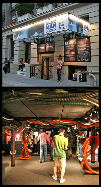 The group itself was formed in 1988 by Matt Goldman, Phil Stanton, and Chris Wink, motivated by an interest in creating a show which involved audience collaboration. Their first theater performances were at La MaMa in the East Village; in 1991, they moved to the Astor Place Theater (seen in the photo). The characters are three mute Blue Men (played by rotating cast members), their faces in blue grease paint and wearing nondescript black clothing. The extraordinarily unique performance art show, called Tubes, is heavily music-oriented – numerous unique instruments were created by the group, such as the tubulum, drumbone, and airpoles. Comedy, satire, social commentary, irony, painting, percussion, clowning, and sophisticated lighting effects are all there, along with numerous substances (including food and paint) thrown and ejected, some of which may hit audience members – the first few rows are provided with plastic ponchos…