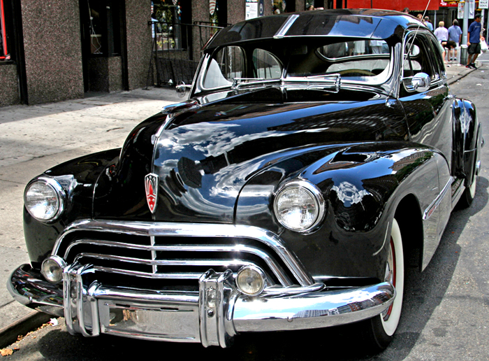 Here’s a new twist. While walking up to B&H Photo with a photographer friend, we came upon this antique 1947 Oldsmobile on 9th Avenue. The owner, Brian Atkins, was taking photos of passersby (for a small charge) who wanted to pose with the vehicle. In conversation with him, we agreed that cars make great subjects for photography. I recently shot a number of autos in an antique car show I happened upon in Connecticut, but I have not posted them here since they were not in NYC.