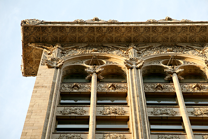 This was renowned visionary Chicago architect Louis Sullivan’s only work in New York City. Sullivan (1856-1924), father of the skyscraper and Modernism, was trained at MIT and the École des Beaux Arts in Paris. He was the leading designer of the Chicago school and employer and teacher of Frank Lloyd Wright. He is credited with coining the term “form follows function.” This is interesting, since the ornate nature of this building shows how Sullivan was not dogmatic about his design ideas. Note the the terra cotta facade and spectacular ornamental elements and friezes under the cornices. At the time of its construction in 1898, the structure was considered very advanced – a very large percentage of the building wall is glass window. The building definitely deserves a good look if you are in the neighborhood…