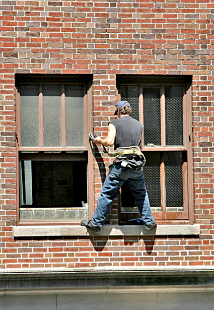 I have learned a number of things about window washing. It is dangerous. It’s a good job for voyeurs. Stories and cliches abound about the things window washers see, propositions from the wife home alone, and the access washers have to the homes of the wealthy. There are various ways to access windows, such as scaffolding, window hooks, and belts, as seen in the photo. Some windows are accessed strictly by walking on a ledge with no safety equipment, just holding on with one’s hands – this is how the windows of my office are cleaned.