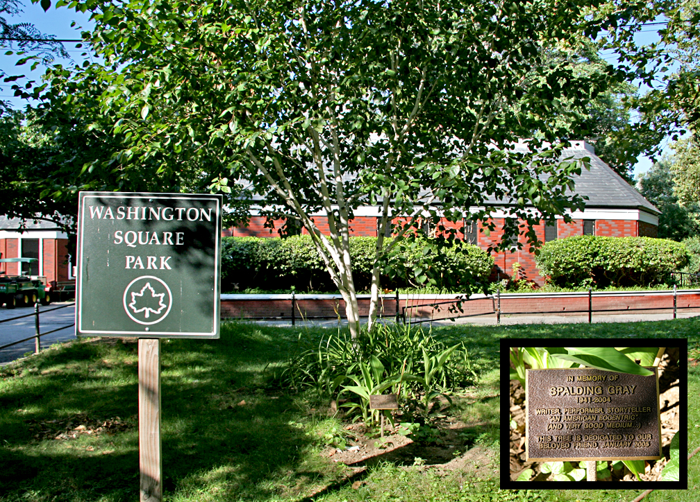 This tree and plaque in Washington Square Park is a relatively unknown memorial to Spalding Gray (1941-2004). If you are unfamiliar with Spalding and his work, I suggest you go to his website here. Spalding was an award-winning monologist par excellence, although his work and life were certainly controversial. Gray wrote 18 monologues and appeared in many films. He is most well-known for Swimming to Cambodia, the filming of one of his monologues based on his experiences in Southeast Asia while working in a small acting role in the film The Killing Fields. In January 2004, he was reported missing (read the article here). In March 2004, Spalding’s body was found in the East River. It is believed his death was a suicide and that he jumped into the river from the Staten Island Ferry. He had threatened to do this in a note to his wife in 2003 (click here for the entire story). He had previously attempted suicide in 2002, and his mother had also committed suicide. Spalding moved to NYC in 1967 and lived in the Village.