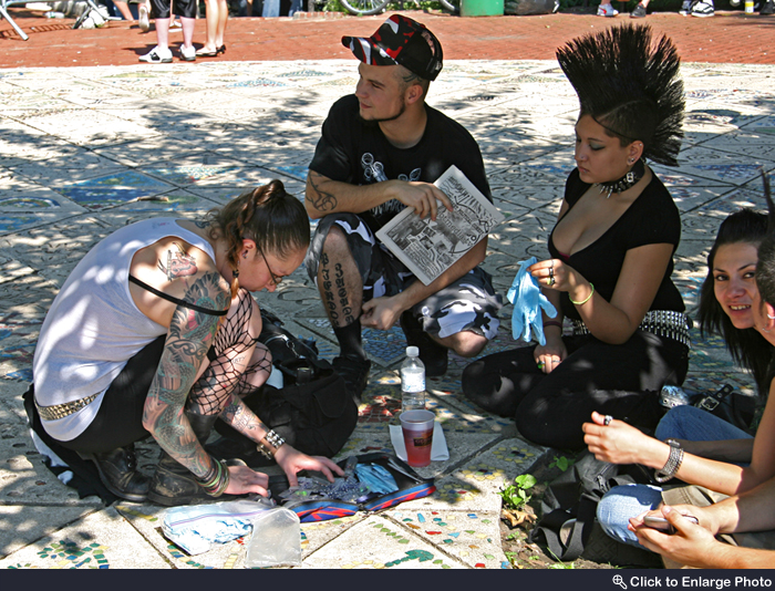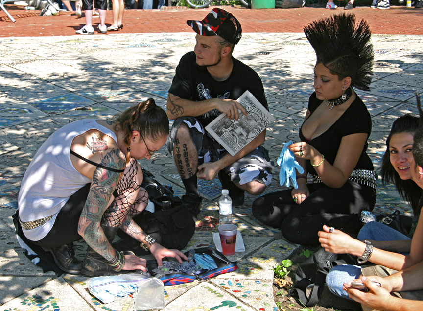 This photo is a footnote to yesterday’s posting about the Police Riot Concert held in Washington Square Park. Click here for a photo collection. When I told people, young and old, that I had photographed piercings being done outdoors on the ground, everyone had the same reaction: “Outdoors, on the ground?” But I found it in keeping with the defiant spirit of the event. After all, I am not sure that prudence, propriety, and proper procedure apply to attendees of a punk rock concert. At first glance, I was not sure why these people were sitting on the ground looking looking at something, but closer examination revealed the object of interest to be a small zippered case opened to display body piercing jewelry and disposable rubber gloves (and, I imagine, the piercing tools themselves). Actually, it appeared that the piercer was operating as professionally as she could under the circumstances.