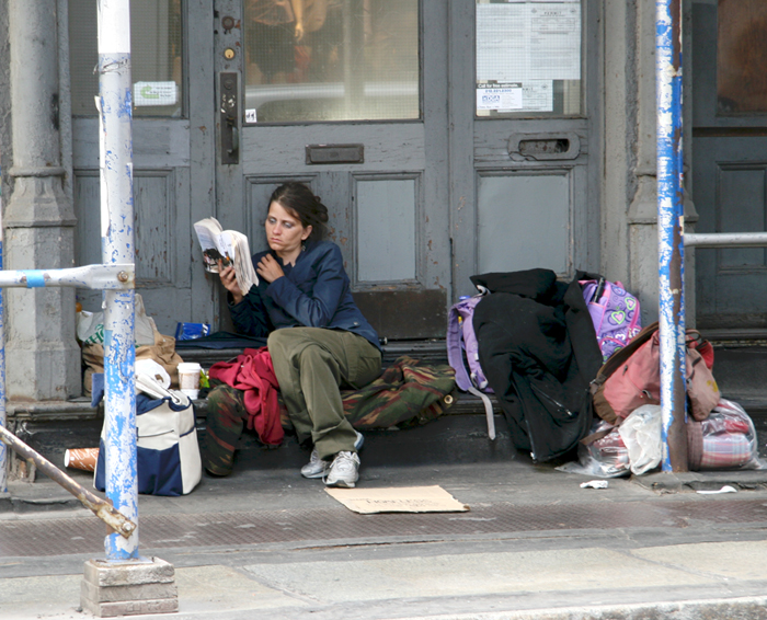 Stephanie Green is a homeless woman who reads voraciously. That is what intrigued me most about her – she is nearly always reading – quality books, including classics, most given to her by various people who have made her acquaintance. For the last year, I have seen her at this spot nearly every day, living in front of a vacant store in SoHo, partially sheltered by overhead scaffolding. Click here for more photos. She wears jewelry, and at times I have seen her put on makeup. I had naively thought that this would be the first story I would write based entirely on a personal interview. I spoke to her on a few occasions, being the first to ask if she would be willing to talk about herself and be photographed for this website. She agreed. However, the “interview” was extremely awkward, and she was not as forthcoming as I had hoped.