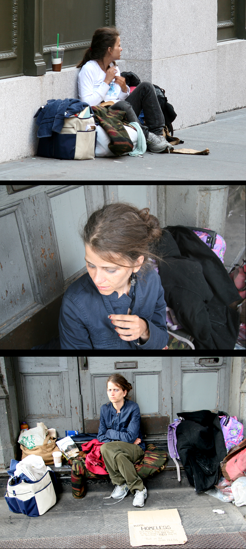 I did learn that she was from Santa Monica, California, born February 5, 1980. She has not had contact with her family. She occasionally stays in homeless shelters. I did not learn much else – how did she become homeless, does she have any hopes, does she bathe and where, does she have drug problems, do any of her belongings get stolen when she leaves them? In addition to her own efforts at collecting money, she did tell me she has a boyfriend (also homeless) who scavenges for food and money which they share. When I asked if anyone else had taken photos of her, she showed me some color printouts from pbase (an online photo site) (click here). She recently moved – I saw her in the Village on University Place. So it was time for these photos to be posted…
