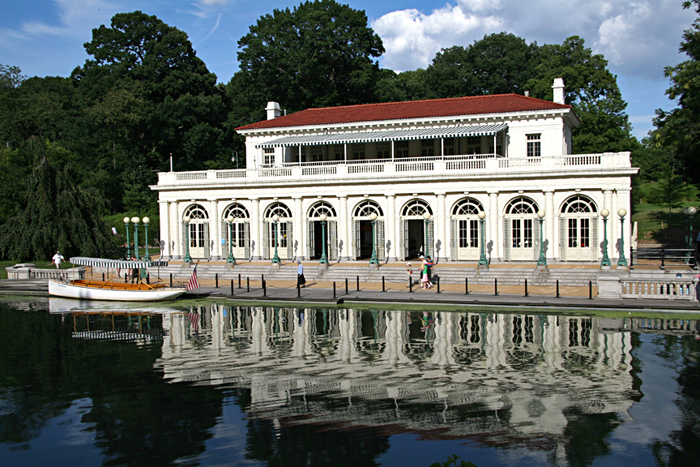 Famed landscape architects Olmsted and Vaux, who designed Prospect Park in Brooklyn where this building is located, built the original Boathouse in 1876 as a rustic canopied structure on piers straddling the north end of the Lullwater. In 1905, it was replaced with the current Beaux-Arts structure seen in the photo. Its design was inspired by the lower story of Sansovino’s Library of St. Mark, built in 16th-century Venice. The white matte-glazed terra cotta facade is adorned with Tuscan columns capped with a balustrade. The building was relocated to the Lullwater’s eastern edge to provide a vantage point for sunset views over the water.