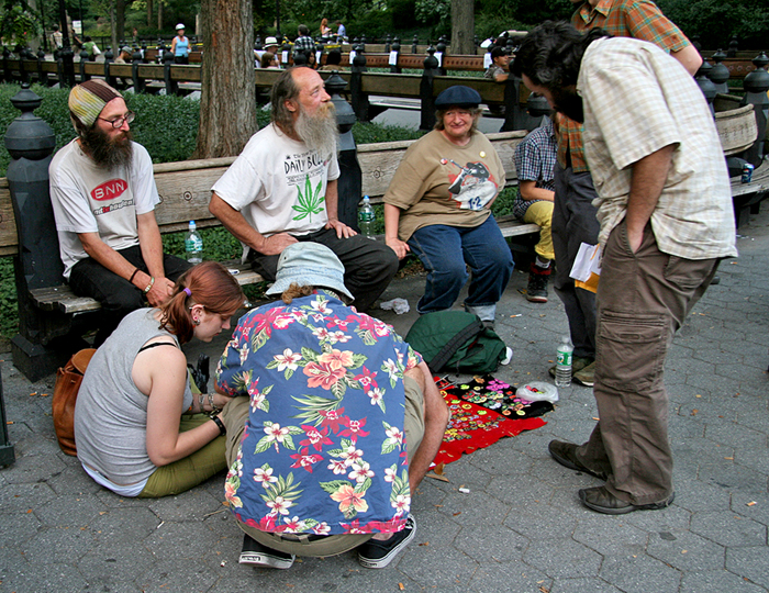 This year is the 40th anniversary of the Be-In and Summer of Love, which was centered in San Francisco in 1967. Yesterday’s event, Be-In Central Park, was held from 2 – 7:30 PM at the Bandshell and sponsored by the Yippie Museum (click here for previous post). This is the second commemoration of the Be-In in NYC this year (click here for the previous event in Washington Square Park). Live bands were present. I arrived at 6:45 PM to the last band and a very small group – I hope the turnout was better at midday. I found the situation quite sad and depressing. Many of the participants appeared to be hippies, burnouts, drug addicts, marginalized, counter-cultural, or political activists. I don’t think this motley, unkempt group are very good role models for the future. When it comes to advocacy (one recalls Timothy Leary’s “turn on, tune in, and drop out”) I think it is reasonable to judge the message by its messenger(s), and in this case, regardless of how one defines success, I think the drug message has to be called into question.