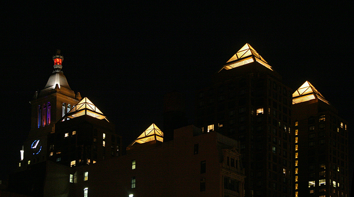 Real estate developers, along with architects, define the look of a city, and the empire and legacy of William Zeckendorf Sr. (1905-1976), his son William Jr., and grandsons Arthur and William Lie continue to endure and impact New York. These are the Zeckendorf condominiums (read about them here) at One Irving Place, as seen from Union Square in the evening with the Con Ed tower. I have photographed these towers before for this website, but I have not shown all four in one photo. Real estate developers are typically not seen in a very positive light by the average citizen; rather, they are resented by many for their wealth and the power they have over the primary assets of a city – the land and buildings themselves. However, they are absolutely necessary to the city’s infrastructure, growth, and reconstruction, and when there is a good design aesthetic and sensitivity to appropriate architecture, they can be a force for the good.