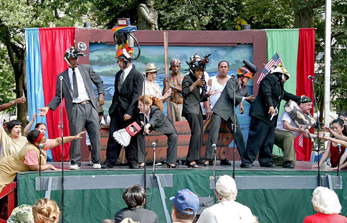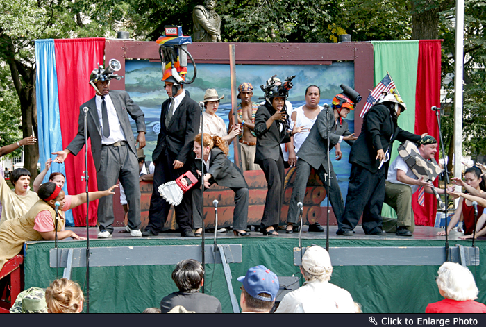 As a long-time resident of NYC, I am ashamed to admit that I have never been to a performance of Theater for the New City. That still holds true, because even though I did take photographs for this posting, it was at the tail end of a free performance in the park of Buckle Up. TNC is a leading Off-Off Broadway theater known for its avant-garde, experimental work, radical political plays, and widespread community service (click here for their website). In reading about the company, I have become very impressed with their accomplishments – they have won the Pulitzer Prize for Drama and over 40 OBIE Awards for excellence in every theatrical discipline. Nobel Prize winner Gao Xinjian’s first play in America was performed at TNC in 1997.