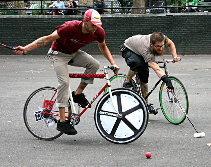 What we are seeing here is Urban Bike Polo, a much rougher variation with fewer rules and equipment which has evolved for the urban environment, with traffic cones for goal posts, street hockey balls, plastic mallets, and most often track bikes (fixed gear). It’s bike messenger-style meets polo. And as I read further, I found, of course, that there is a world associated with this activity – websites, newspaper and magazine articles, equipment vendors, teams, clubs, championships, and hundreds of videos on YouTube, including one taken with a malletcam (video camera installed in a mallet) (update 1/19/12: Video is private). One NYC team is appropriately named the Ratkillers. Makes me feel like where have I been and why was I the last to know?