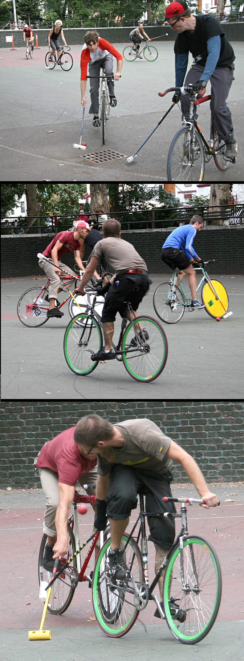 I really thought I was witnessing something relatively new, probably developed in NYC. An urban-styled twist on a classic sport. But as it turns out, Bike Polo, Cycle Polo, or Bicycle Polo has been around since the late 1800s. It was invented in Ireland in 1891 by Richard J. Mecredy and was played as early as 1900 by the British army and the Indian Maharajas. It is a relatively formalized sport, played on a court (typically grass) with various rules and regulations governing play and equipment. This is the sober, suburban version (click here for the American Bicycle Polo Association). The game I ran across (shown in the photo) was in the Sara D. Roosevelt Park in the Lower East Side (click here for more photos).
