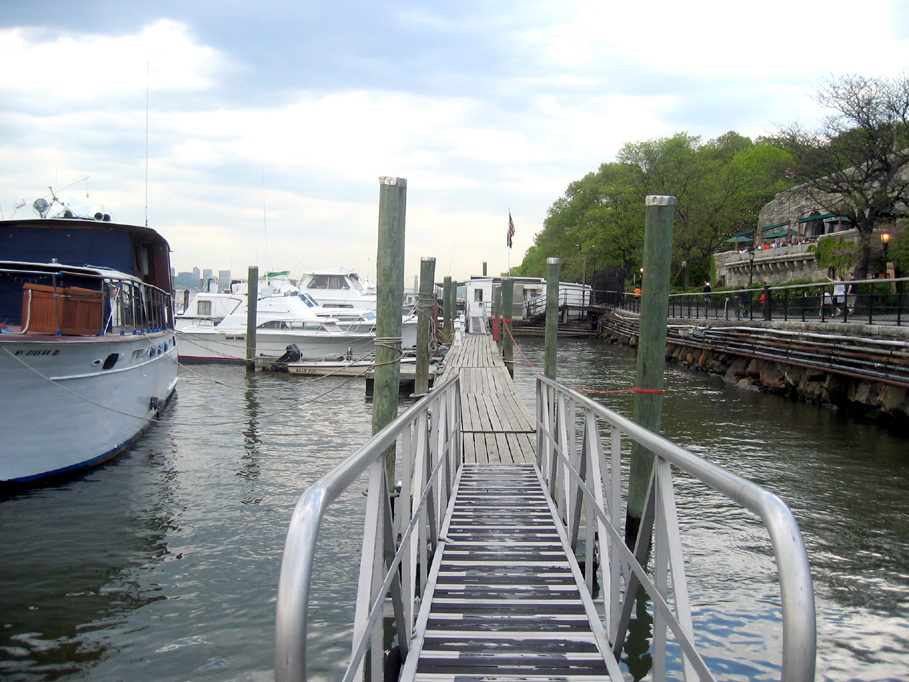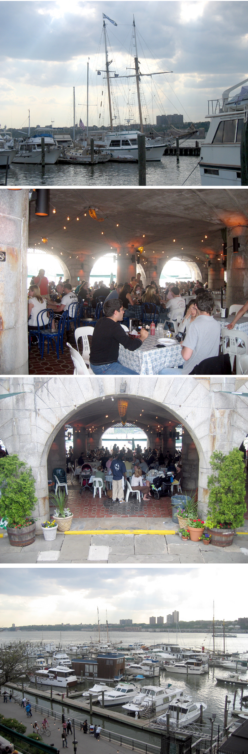 Not far from Lincoln Center, on the west side along the Hudson River and Riverside Park, is the 79th Street Boat Basin, built in 1937, originally for yachts and now home to many houseboats and recreational boats. Some tenants live there to escape the high costs of housing in Manhattan. There’s a cafe (the Boat Basin Cafe), which is open in the warm weather and set into arches facing the River (see right side of photo), which is worth trying if you come to this part of the city. The views and the crowds of neighborhood people out enjoying themselves make it a very enviable spot; otherwise, it’s just a basic bar that serves a very simple lunch, brunch, and dinner. The pedestrians, runners, baby carriages, dogs, rollerskaters (all on the Greenway), and people who watch them go by from the benches show a good cross section of the typical Upper West Side neighborhood residents. More photos here…