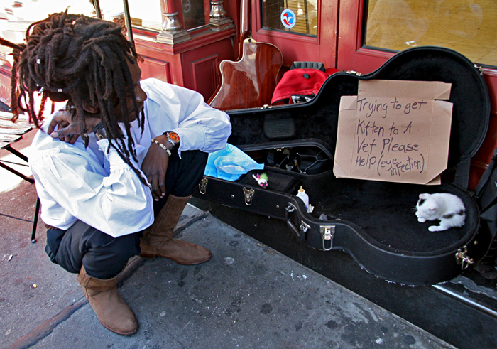 Jamal is a regular in the neighborhood; I met him last summer when he was working as Pedicab driver. So I was surprised to meet him on Bleecker Street in the West Village with a 4-week old kitten in a guitar case. The kitty, which he had rescued from a subway platform, also had an eye infection. Animals in need will certainly get people to rise to the occasion, even from New Yorkers, who are frequently stereotyped as unsympathetic.