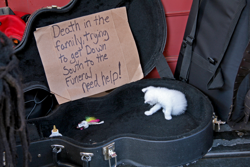Poor kitty. Hope he’s feeling better by now. Does Jamal play the guitar, or just use the case to tote the cat & sign around?