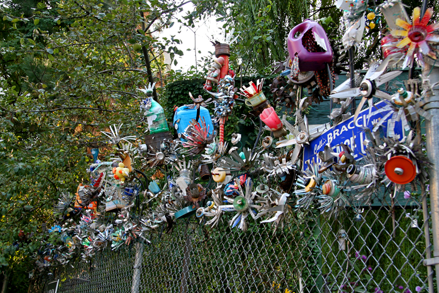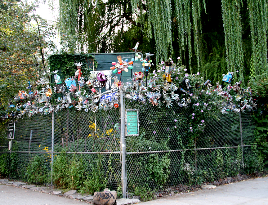 La Plaza Cultural Garden is located at 9th Street and Avenue C. I have read that the flowers along the fence, created from tin cans, detergent bottles, beer caps, and other junk, were done by a local resident known as the “Flower Man.” It also appears that some or the creations are birdhouses (click here for closeup photo). This garden, established in 1976, has a very complex and extremely fascinating history. Read more here and see their website here. There are many events held here, and the garden functions as a performance space and cultural center.