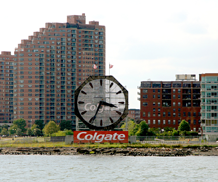 The Colgate Clock is not in NYC but in Jersey City, New Jersey, on the banks of the Hudson River. Although New Yorkers complain and joke about New Jersey, it plays an important part in the city’s economy, services, and labor supply. The New Jersey skyline is the dominant view from Manhattan’s west side, with the Colgate Clock readily visible from lower Manhattan. At 50 feet in diameter, the current clock is claimed to be the largest in the world. It is a replacement for the original clock (38 feet in diameter) from 1904, made by the Seth Thomas Company; it has been relocated to a Colgate factory in Clarksville, Indiana. The octagonal design was based on Colgate’s Octagon Soap. The toothpaste tube was added in 1983. Read more here.